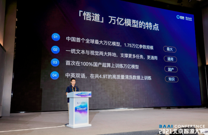 ▲北京智源人工智能研究院學術副院長唐杰介紹“悟道2.0”模型的具體情況