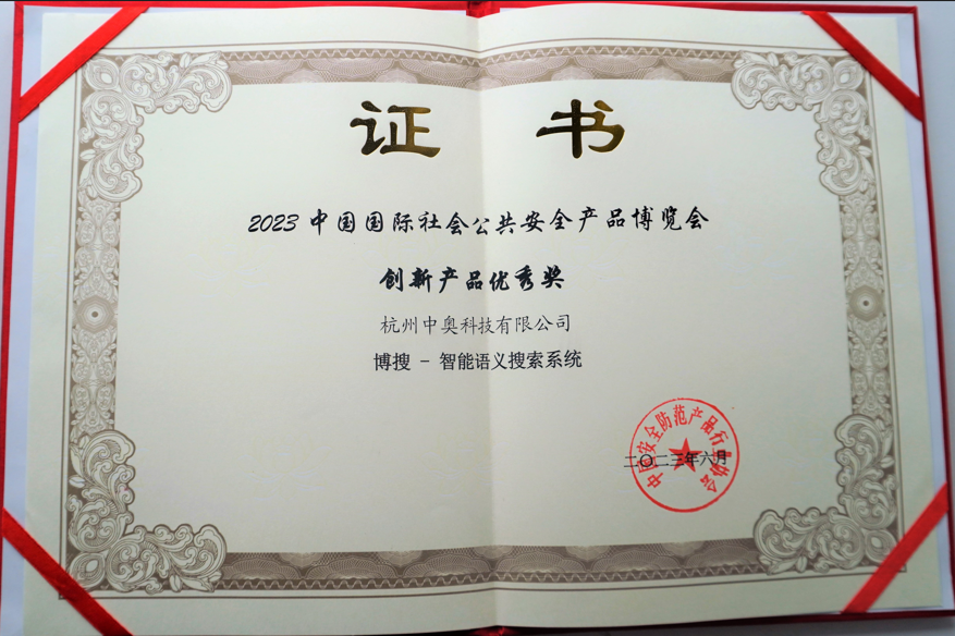 2023年6 月 7 日,第十六屆中國國際社會公共安全產品博覽會(簡稱“安博會”)在北京首鋼會展中心盛大開幕。作為安博會重磅活動“第八屆優秀創新產品推薦頒獎儀式”同期在北京首鋼會展中心舉辦。經過一年多來網評初審和現場專家復審,中奧科技憑借“博搜-智能語義搜索系統”斬獲“創新產品優秀獎”。