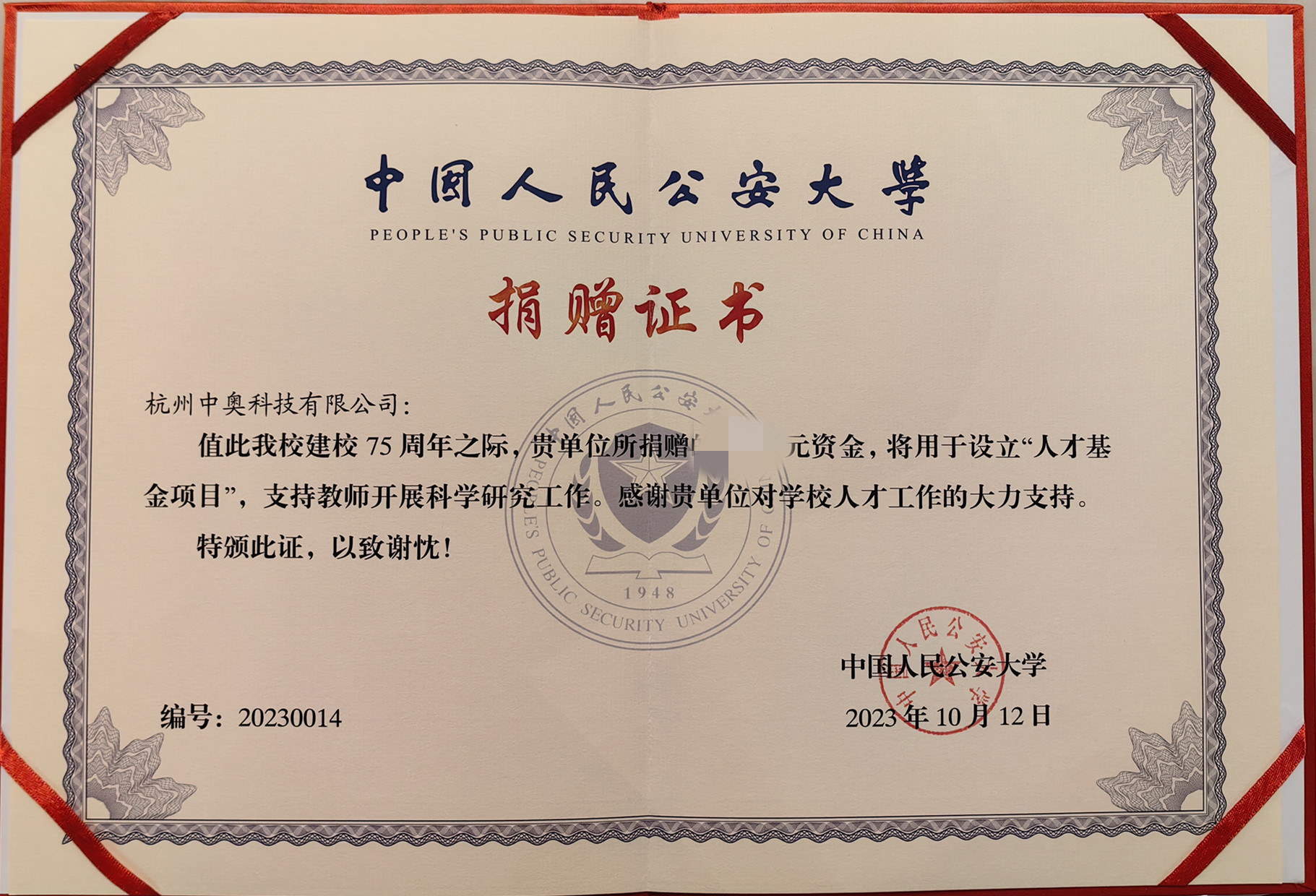10月12日,在中國人民公安大學迎來75周年校慶之際,由中國教育發(fā)展基金會牽頭,中奧科技、科大訊飛、美亞柏科等多家高新技術企業(yè)共同發(fā)起“人才基金項目”。該基金旨在支持中國人民公安大學人才培養(yǎng)、師資建設,向鍛造一流公安人才隊伍目標邁進。杭州中奧科技有限公司作為該基金成員單位,積極參與該基金的發(fā)起與運作,并與中國人民公安大學正式簽約。