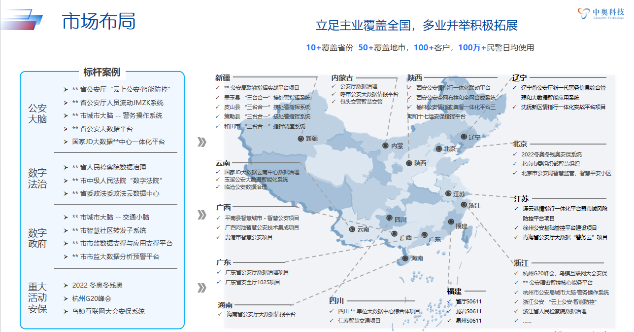 作為國內政務、政法數智領軍企業,中奧科技深耕數智大腦15年,專注于以產品與方案組合方式服務公安領域 10+ 年,通過業務+數據+智能融合方式引領行業數智發展,構建生態合作體系,堅持自主創新,擁有 30 +軟件發明專利、110 +軟著、 創建10 +產學研聯合實驗室,沉淀 100 +算法模型及AI應用,為杭州G20峰會、烏鎮互聯網大會、2022北京冬奧會等活動提供核心數智技術安保服務。